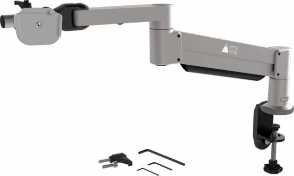 Table clamp OneHand, keeps devices weighing 0.7-3 kg (1.5-7 lbs) “floating” for easy repositioning. Device can be moved 90° vertically and 360° horizontally.