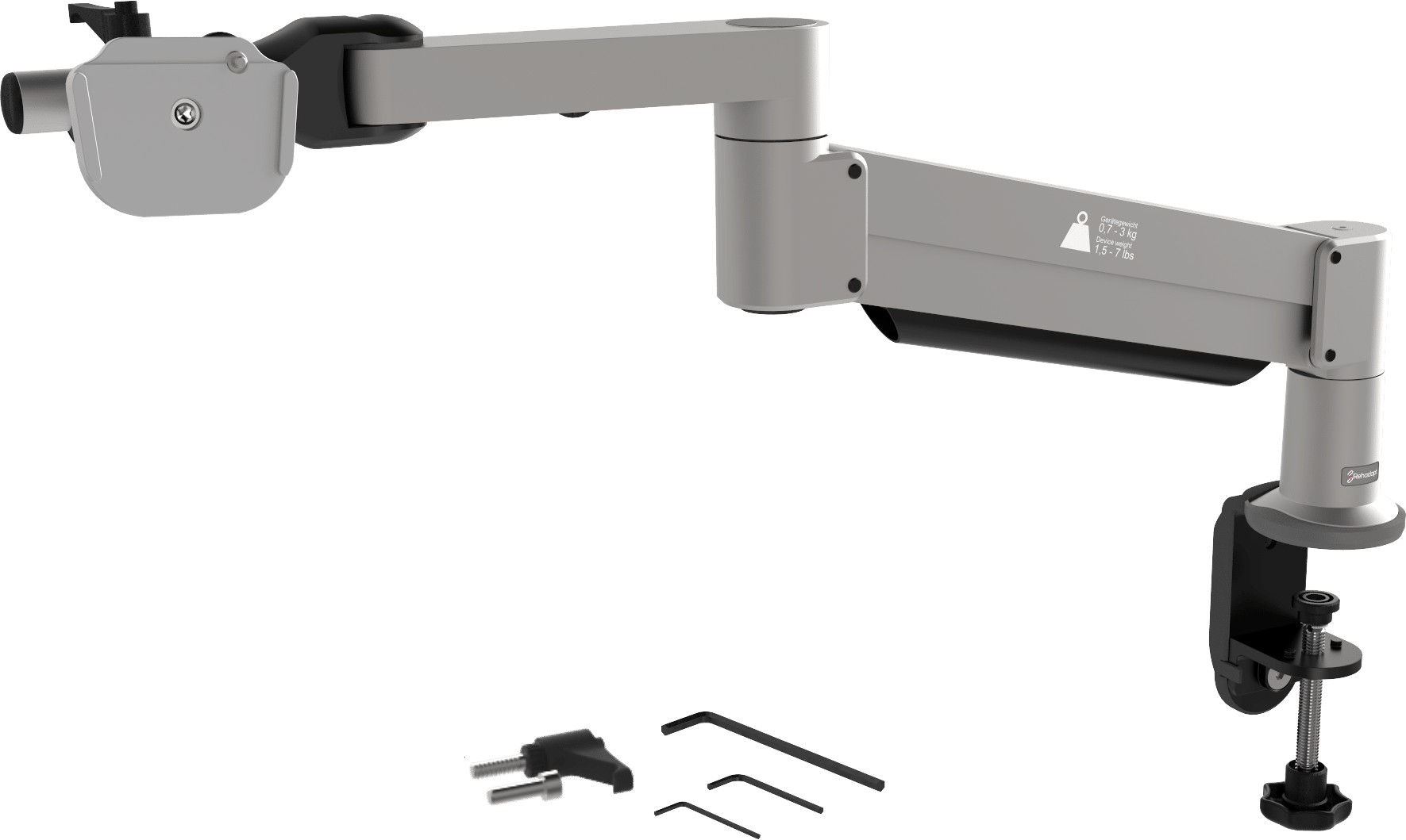 Table clamp OneHand, keeps devices weighing 0.7-3 kg (1.5-7 lbs) “floating” for easy repositioning. Device can be moved 90° vertically and 360° horizontally.